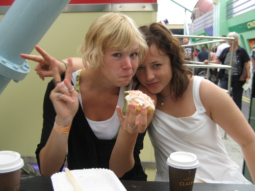 Oh, glömde nästan att berätta: Emlan hit och hälsar på om ett par dagar! Ska bli sååå roligt att se henne, kära vän..! hihi. Och hon ska ta med sig OSTBÅGAR samt LÖSGODIS. Fatta hur glad jag är 😀 (Hrm, över att hon kommer så klart). Här är en sjukt rolig bild på oss två, tror det är från Roskilde förra året – jag ser ju heeelt galen ut: